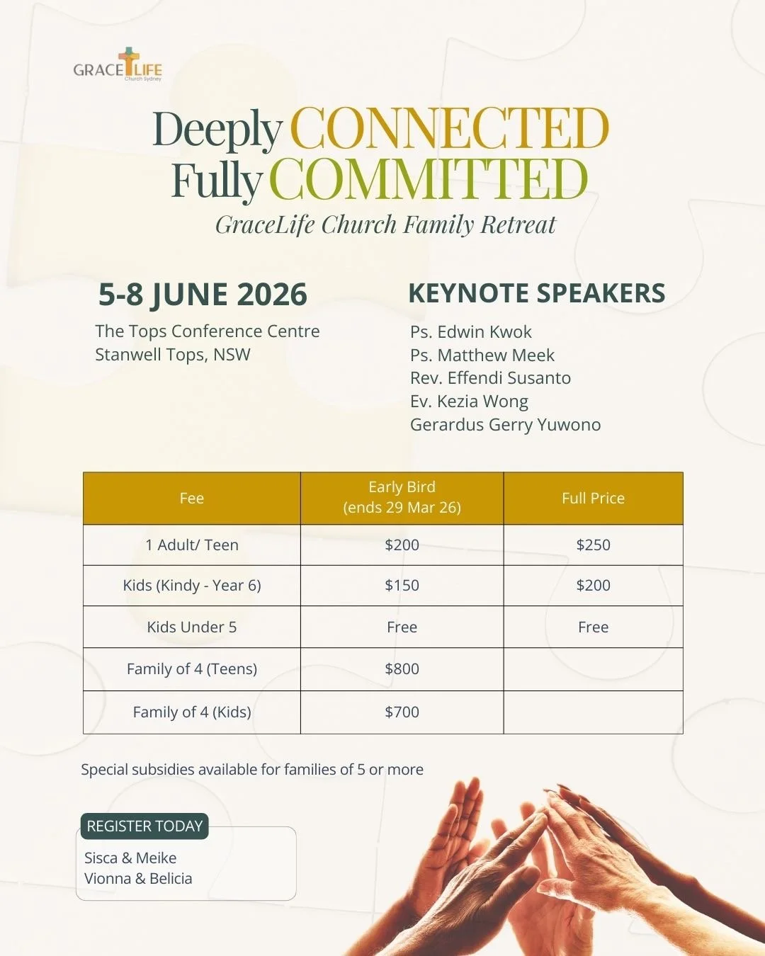 Deeply Connected and Fully Committed. Grace Life Church Family Retreat 2026